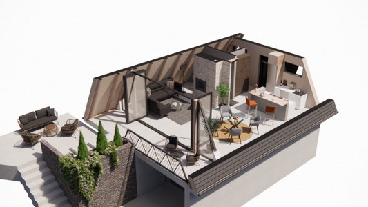 - Krovna obloga ( CLT paropropusna folija, termoizolacija 20 cm, dašćanje krova, folija, podužna letva, poprečna letva, krovna obloga - betonski crep, antracit)